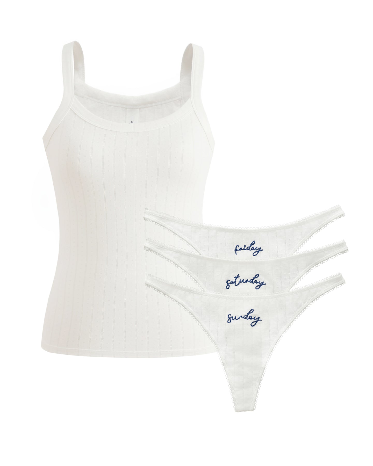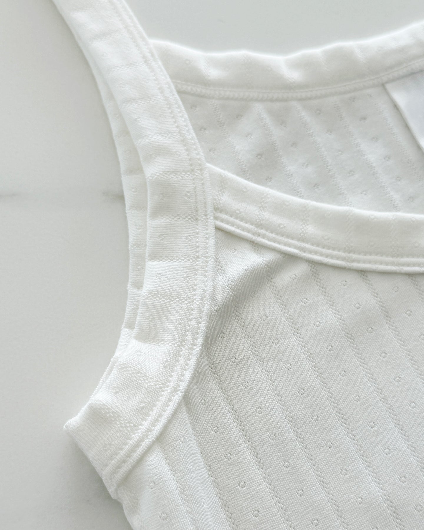 A much loved versatile classic, our organic cotton pointelle tank is the perfect multifunctional piece. This style features a round neckline, wide bias straps and slim fit through the body. Pair with our signature Weekend Thongs, or can be worn layered. A staple for every wardrobe.